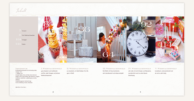 Imke Johannson entführt in fünf farblich verschiedene Weihnachtswelten und leitet an, wie man aus einfachen Materialien stilvolle Dekorationen kreieren und ohne großen Aufwand unterschiedliche Stilwirkungen erzielen kann: